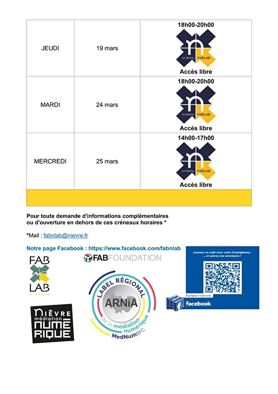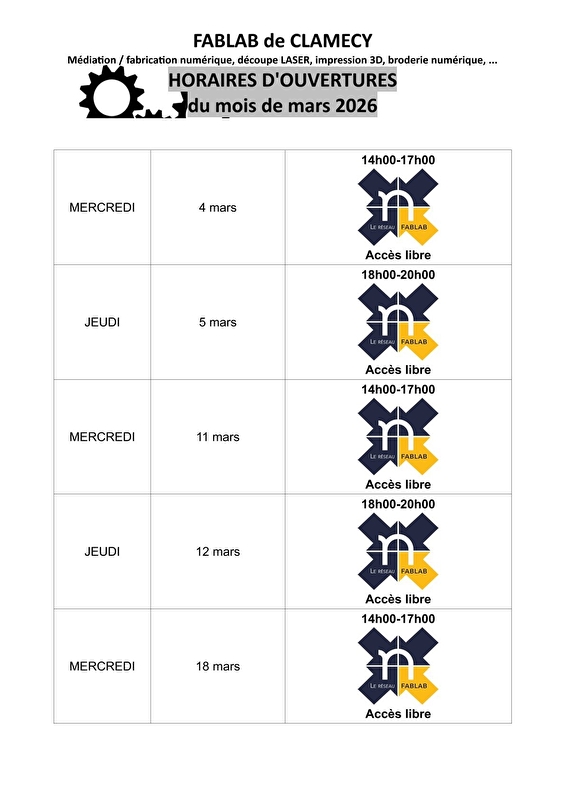 Fablab : Médiation/fabrication numérique, découpe laser, impression 3D, broderie numérique. Du 4 au 25 mars 2026. Le Fab'N'Lab de Clamecy est un espace tiers lieu de rencontres autour du numérique et de la créativité. Outil pour résorber la fracture numérique dans les territoires ruraux, par l’accompagnement aux usages et ouverts à tous les publics, ces « laboratoires de fabrication numérique » sont dotés de machines-outils pilotées par ordinateur, telles que : des machines de découpe laser, à fil chaud et à vinyle ; des thermo-formeuses ; des brodeuses numériques ; des imprimantes 3D… Ils permettent la conception, la réalisation et la fabrication de presque tout par soi-même (bibelots de décoration, stickers, pièces de carrosserie, personnalisation de textiles, …) et dans des matériaux très variés (plastiques, bois, vinyle, tissus, pierre, chocolat,…). Accès libre