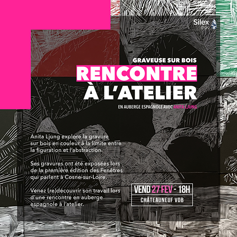 Le 27 février, nous avons le plaisir d'accueillir l'artiste graveuse et imprimeuse Anita Ljung. Elle explore la gravure sur bois en couleur à la limite entre la figuration et l'abstraction. Ses gravures ont été exposées lors de la première édition des Fenêtres qui parlent à Cosne-sur-Loire.