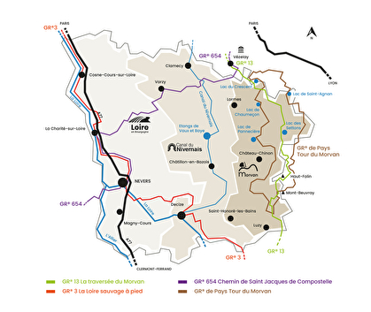 Le GR de Pays Tour du Morvan est quant à lui une boucle de 232 km, dont plus de la moitié se situent dans la Nièvre et sillone le Parc Naturel Régional du Morvan.