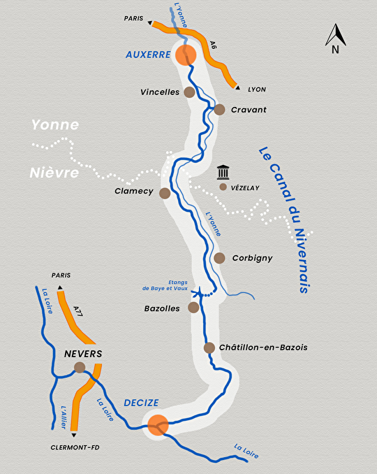 Le temps d'une croisière en bateau ou sur les chemins de halage à vélo, rejoignez les vignobles auxerrois depuis la confluence à Decize. Au cours de ce voyage vous passerez par la vallée de Sardy, et sa nature généreuse, avant de remonter le temps à Clamecy en découvrant l'époque des flotteurs de bois.