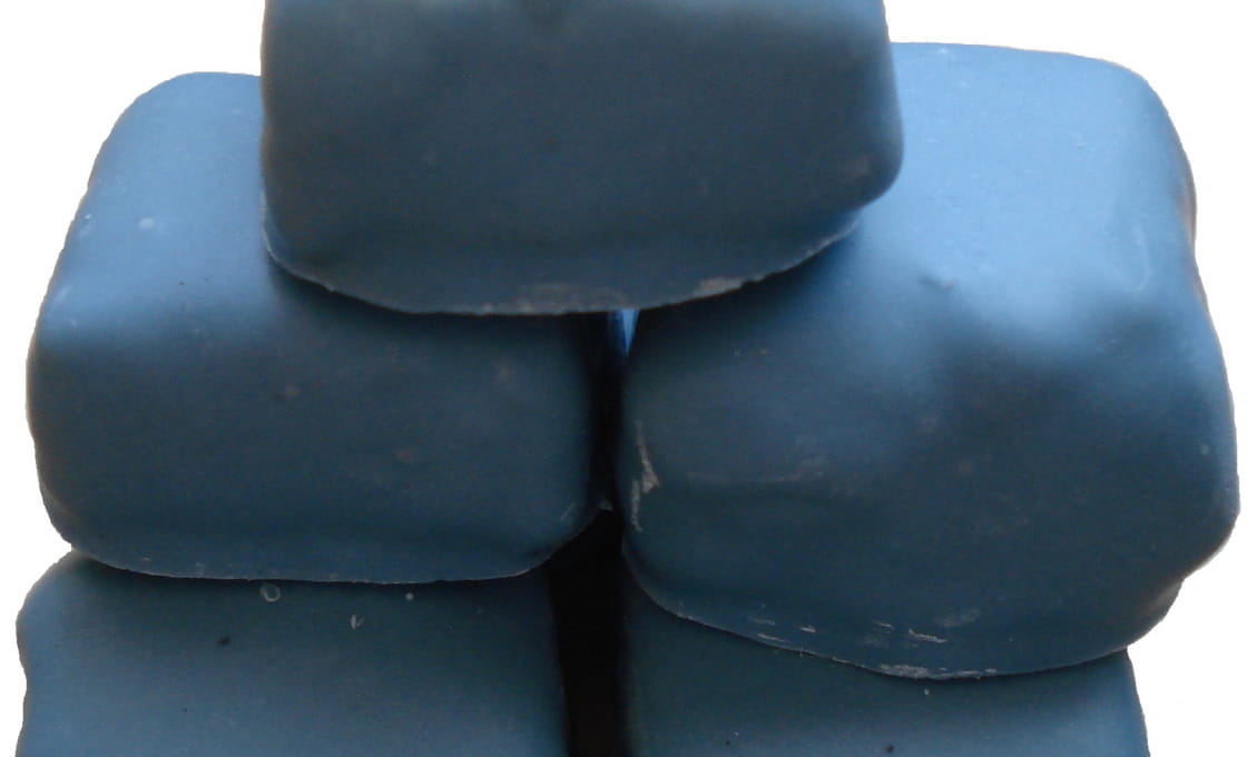 Le Pavé de la Route Bleue est fabriqué à base de praliné noisette entre trois couches de nougatine, le tout enrobé de chocolat blanc qui devient bleu grâce à un colorant alimentaire.
