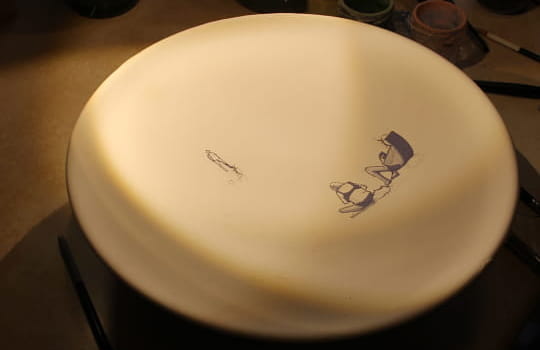 Le cœur de son métier peut commencer : la décoration des pièces. Elle se rend dans son atelier et enfile son tablier ayant appartenu à son arrière-grand-mère (la faïencerie, c’est une histoire de famille !). Les différents motifs des faïences Georges ont été choisis et dessinés en grande partie par Carole, souvent imaginés à partir de ses propres photos. Aujourd’hui elle décore devant nous une pièce phare de sa collection, “La Plage”