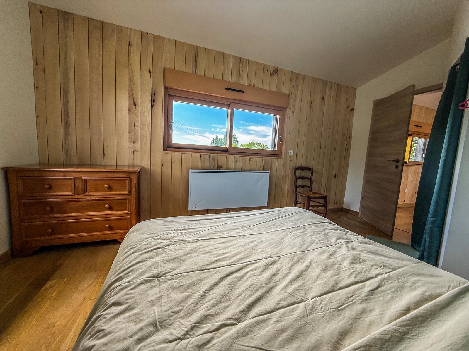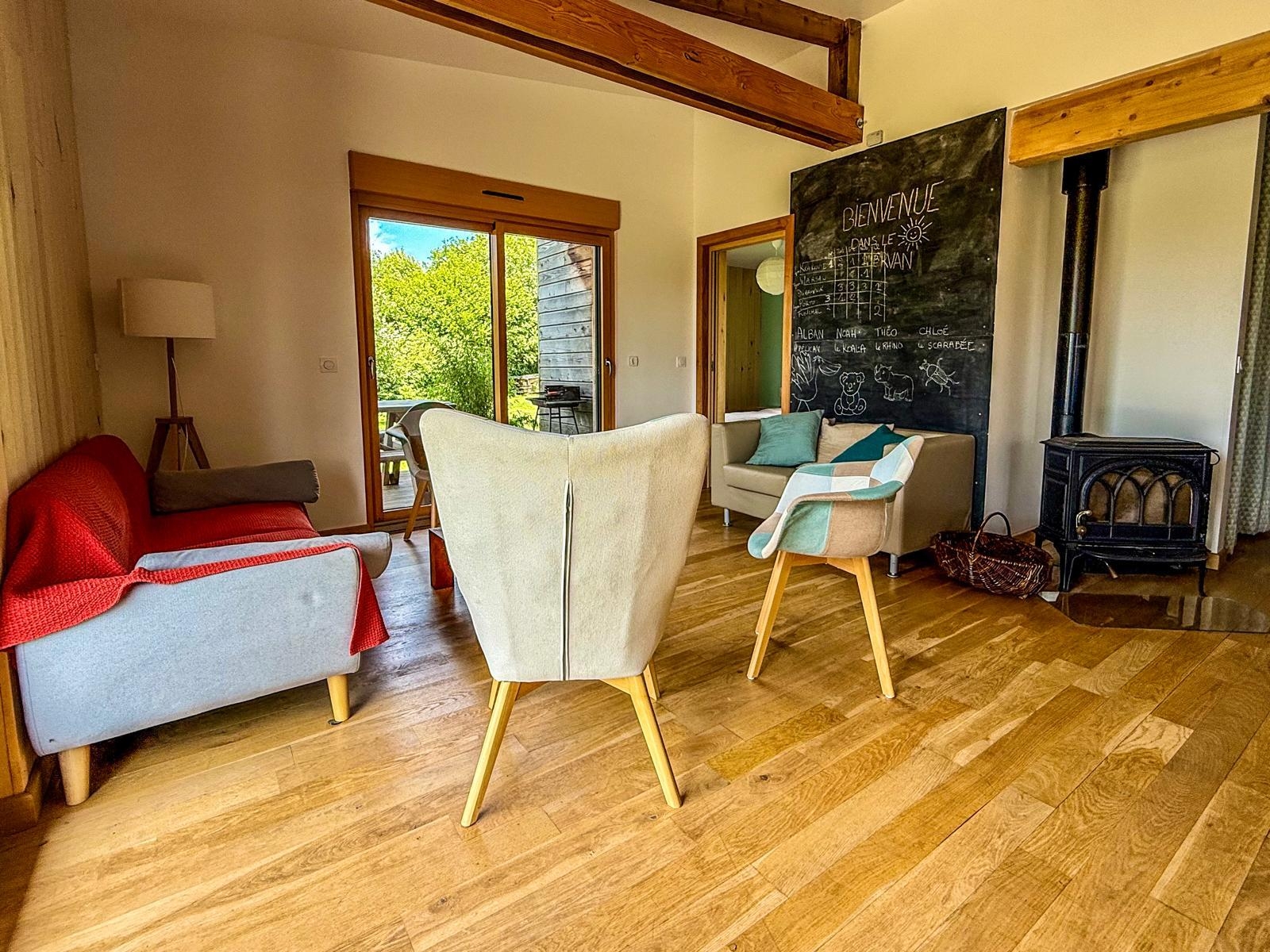 Au rez-de-chaussée, un grand espace de vie avec cuisine moderne et ergonomique, salle à manger et salon où vous pourrez profiter de beaux moments au pied du poêle après une bonne randonnée. De chaque côté de cet espace se trouve les chambres.