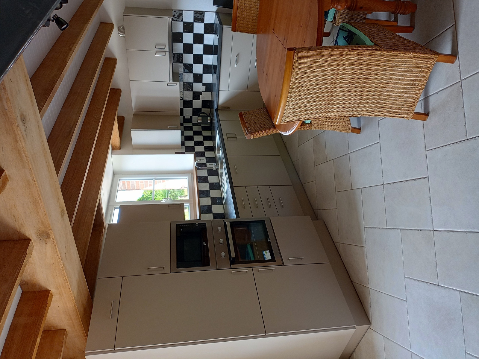 La cuisine, toute équipée, est ouverte sur le salon, douche italienne et toilettes à part sur le rez-de-chaussée.