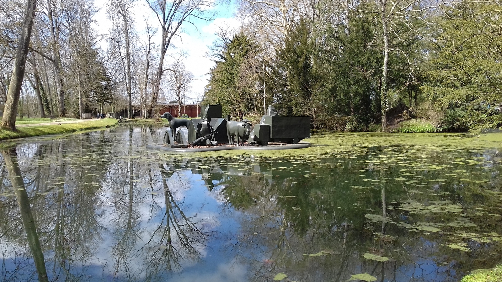 Juste à côté, sur le plan d’eau, flotte une œuvre d’art signée Xavier Veilhan, artiste d’art contemporain. Art très présent dans le parc qui abrita également le Centre d’Art Contemporain.